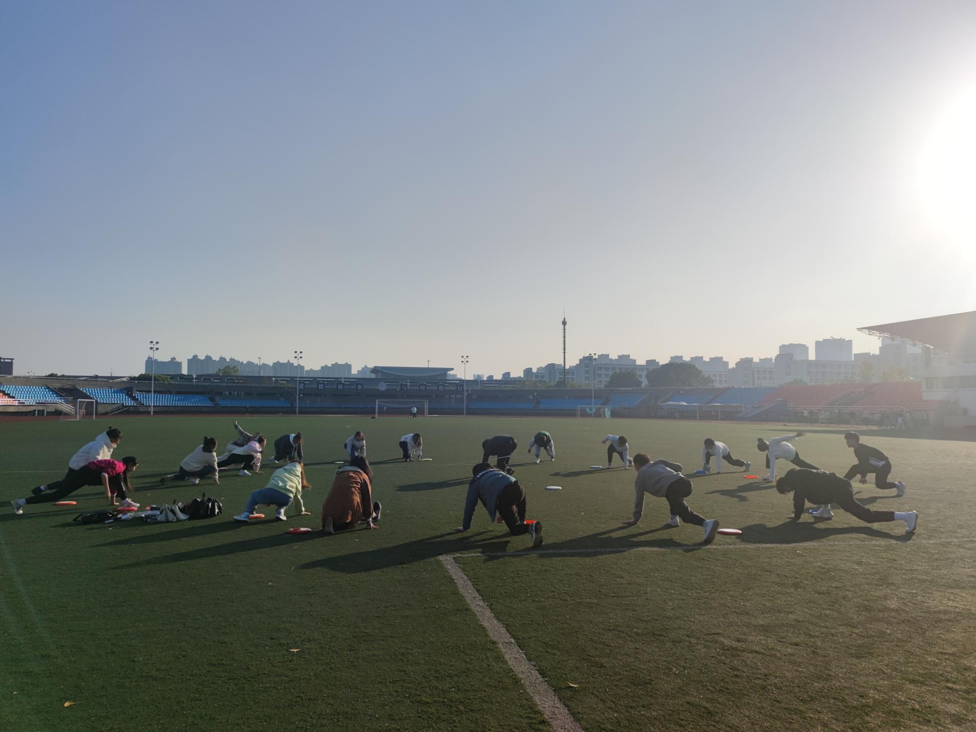 首先,龚成章同学为大家详细讲解了相关动作要领及训练规范,在熟悉传接盘后,龚成章同学组织大家开展了4V4对抗赛。尽管绝大多数同学首次接触飞盘,但是大家很快上手,接盘、闪躲、飞扑、摔倒、起身……同学们动作生疏但也有模有样,大汗淋漓不乏乐在其中。几个回合后,同学们不仅展示了风采,还拓展了交际。