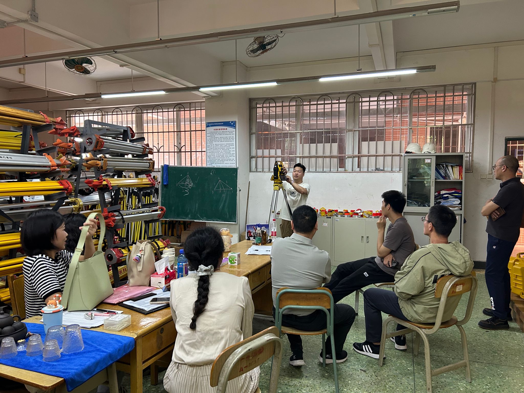 随后,实训管理员陈浩楠结合实际操作,为与会教师现场演示全站仪测量的正确操作方法,并详细讲解户外作业时必备的安全措施。他强调,作业人员需规范穿戴反光衣,在作业区域合理摆放反光锥桶,通过一系列安全防护手段,有效提升户外实训的安全性,为实训人员筑牢安全防线。