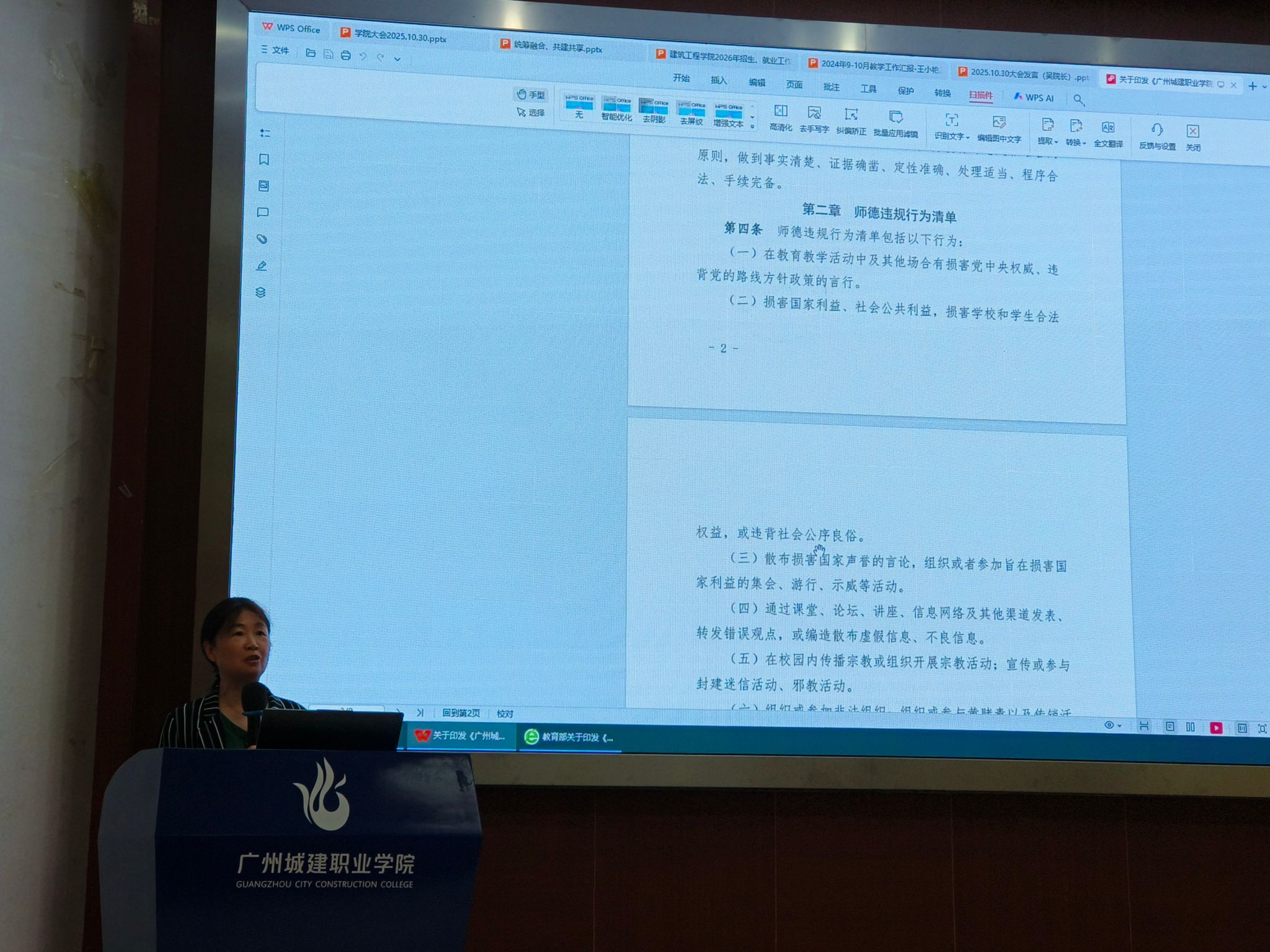 会上,吴承霞带领大家重温学习了《广州城建职业学院师德违规行为处理办理》第二章《师德违规行为清单》,她强调,学院坚持每月一次师德主题学习,大家要深刻认识到师德无小事,必须时刻自重自省,严守红线,维护教师队伍的崇高形象。全体教职工需将学习成果转化为自觉行动,以德立身、以德立学、以德施教,共同营造清正教风。