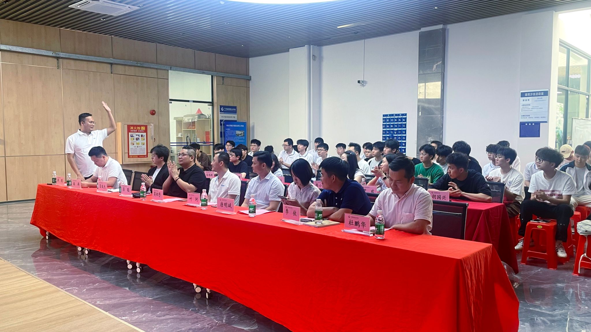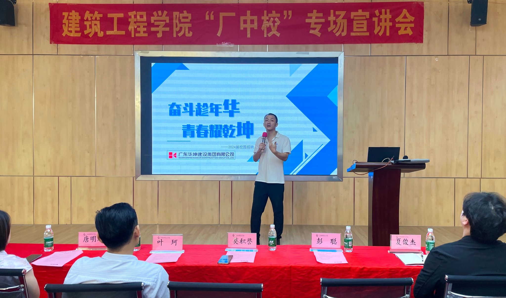 为深化产教融合,创新人才培养模式,助力学生高质量就业。2025年4月29日下午3点在建工机电楼B栋204大厅,建筑工程学院与广东华坤建设集团有限公司联合打造的“厂中校”订单培养专场宣讲会圆满举行。学院党委副书记、副院长彭聪,23级年级组长方晓东,建筑工程技术教研室副主任夏俊杰,广东华坤建设集团有限公司人力行政总监唐明斌、莫积誉,人力行政负责人杜鹏华、呙涛,招采总监叶珂,商务负责人李伙,校友代表项目经理洪瑾等,2023级辅导员及学生代表参加宣讲会。