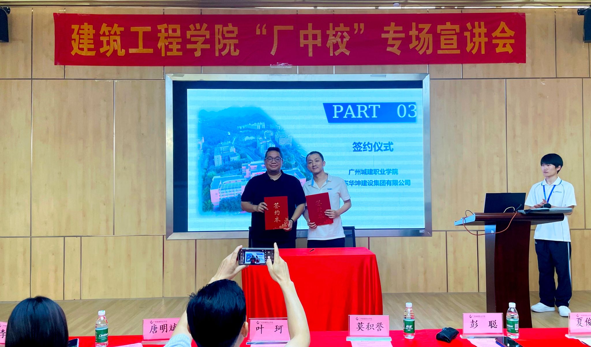 随后,双方就“厂中校”的具体事项达成了共识,并签署了合作协议。接着,莫积誉上台进行宣讲。他回顾了集团与城建学院多年来的合作成果,并对“厂中校”订单培养模式给予高度评价。他提到,华坤集团作为广东省建筑行业龙头企业,近年来承建了多个省级重点项目,对高素质技术技能人才需求迫切。在沟通互动环节,校友代表上台分享了在华坤集团的职业成长过程,强调在校期间的专业知识积累、实践能力培养以及个人综合能力素质提升的重要性。同时,学生们围绕职业发展、技能要求、薪资待遇等踊跃提问,企业代表逐一解答,现场气氛热烈。宣讲活动结束后,同学们积极向企业投递简历并进行面试。