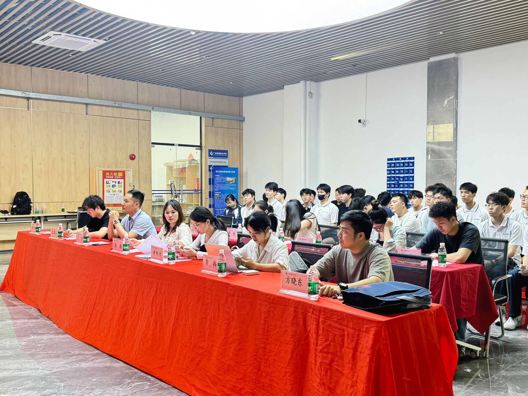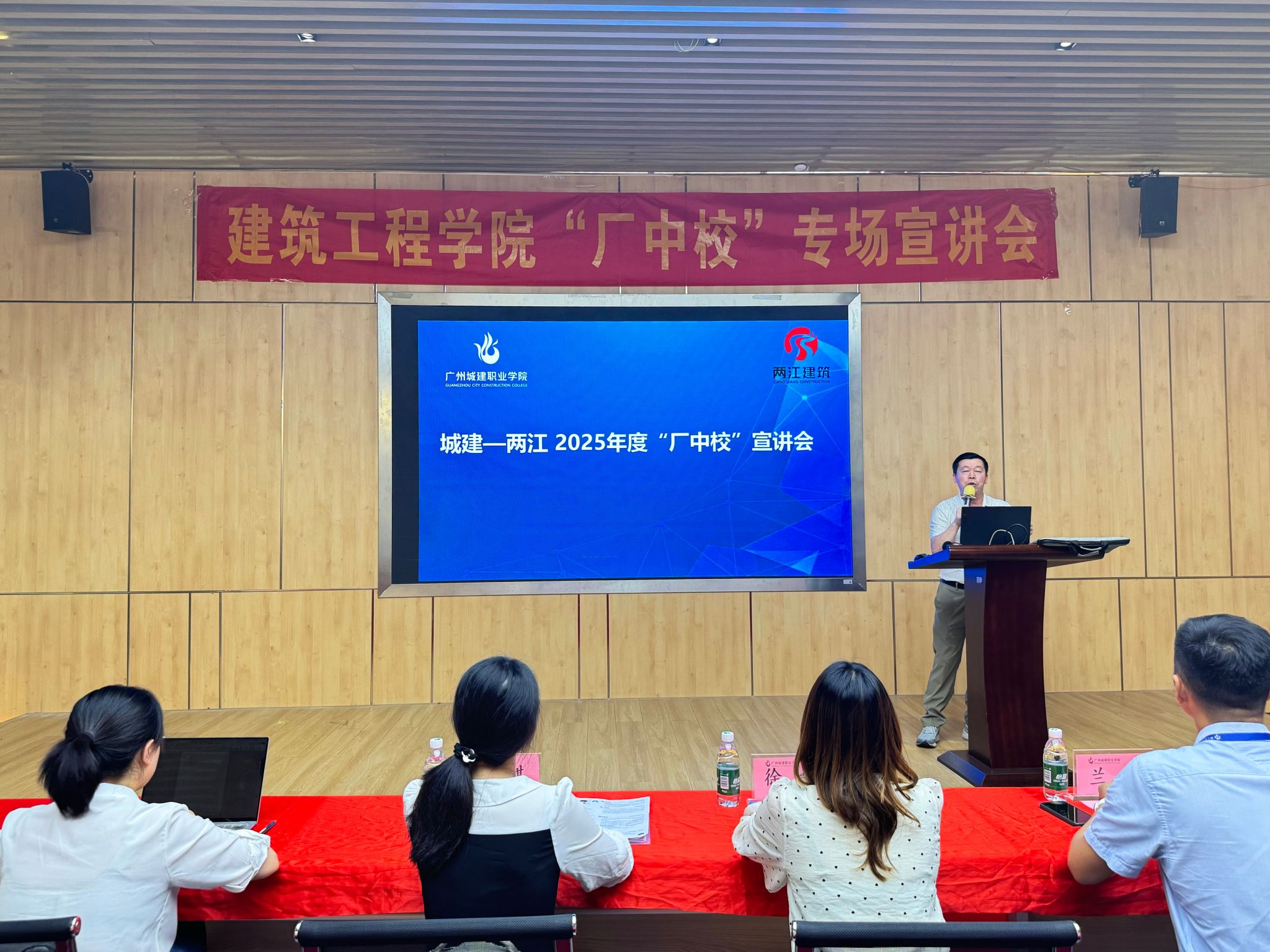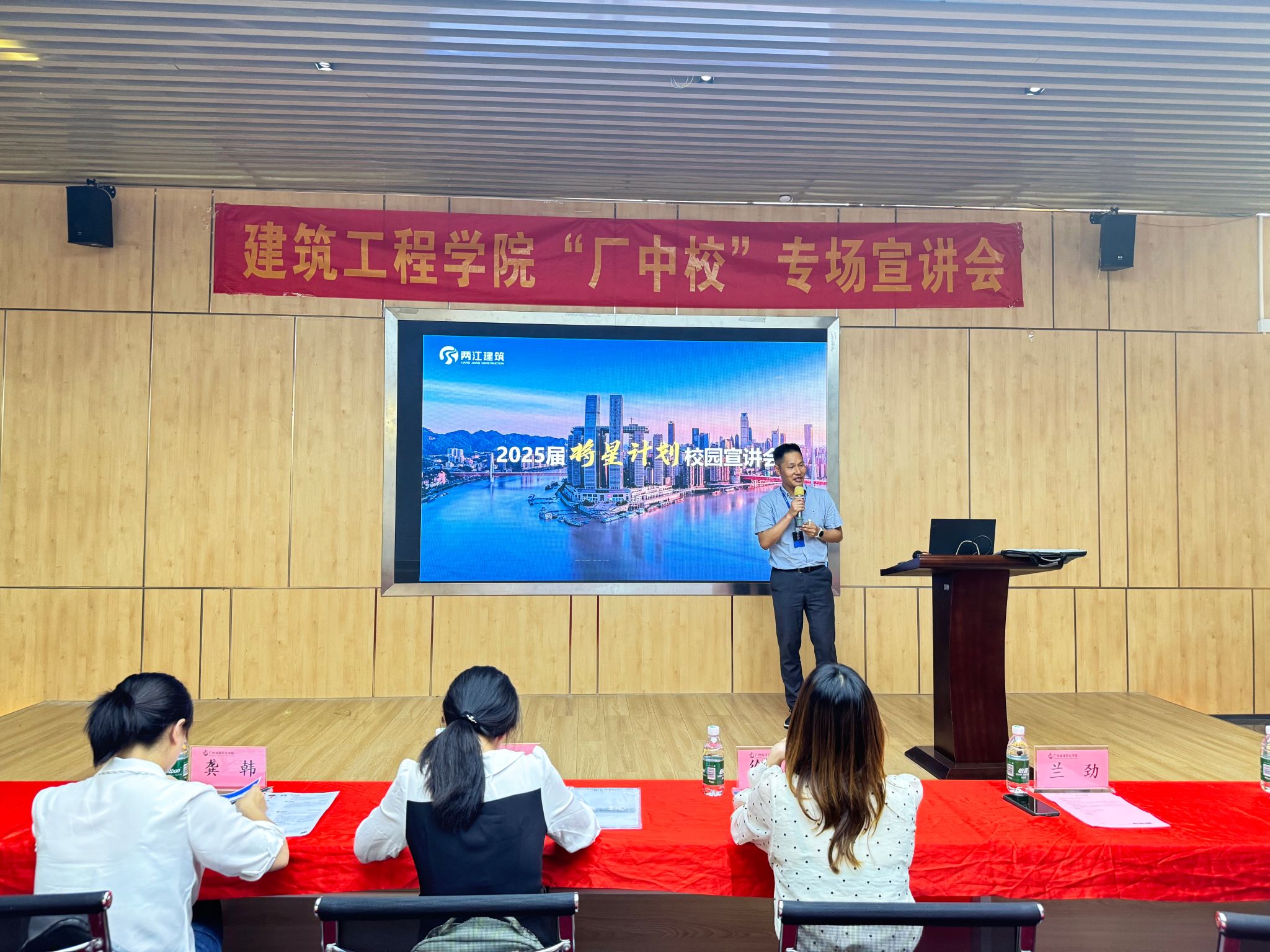 为积极推动校企合作,推动专业人才培养,2025年5月21日下午2点30分,建筑工程学院与重庆两江建筑工程有限公司在建工机电楼B栋204大厅举行城建—两江建筑“厂中校”宣讲会。建筑工程技术教研室副主任夏俊杰、专任教师郑杰鹏,2023级辅导员及学生代表,公司董事长助理兼业务副总经理徐薇,公司总部人力总监龚韩,公司培训总监及两江铁军学院教导主任兰劲,大湾区人力总监黄倚琪参与活动。