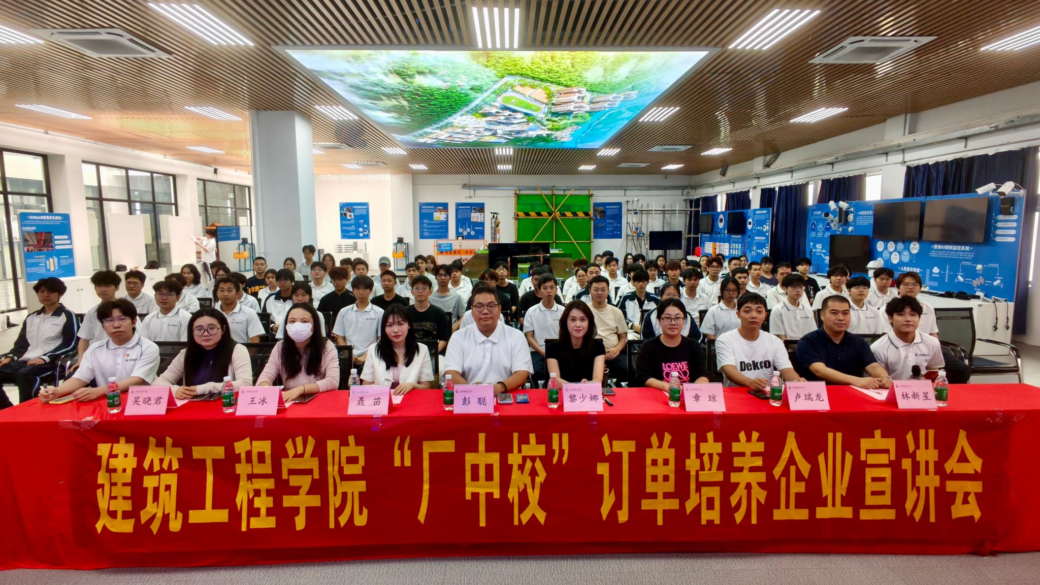 为深入推进产教融合,拓宽学生实习就业渠道,2026年4月16日下午,建筑工程学院在建工机电楼B栋204G教室成功举办2026年“厂中校”订单培养宣讲活动。本次活动特邀广州景烁数据科技有限公司(以下简称“景烁科技”)来校进行企业宣讲与订单培养签约,学院师生代表共计百余人参会。景烁科技人力资源部总监黎少娜、招聘专员聂苗、卢瑞龙、建筑工程学院党委副书记兼副院长彭聪、智能建造教研室副主任章琼、辅导员吴晓君、王冰及24级意向学生。