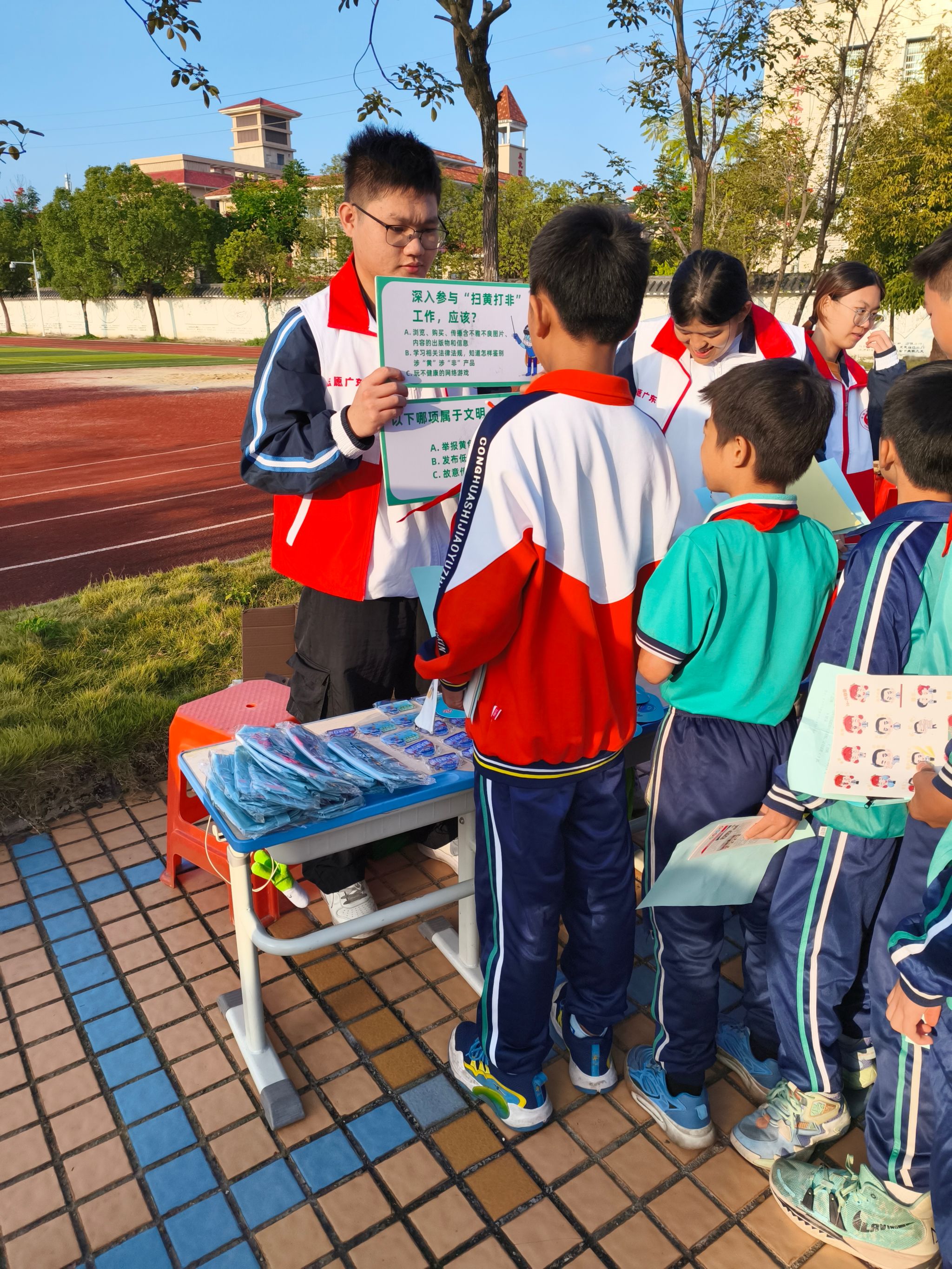 志愿者们在精心布置的展位前开展了“扫黄打非”宣传、清风侠游戏互动等环节内容。通过问答的形式,激发了小学生们的好奇心和求知欲。同时志愿者们还耐心解答了小学生们提出的问题,帮助他们拓宽守法的知识。