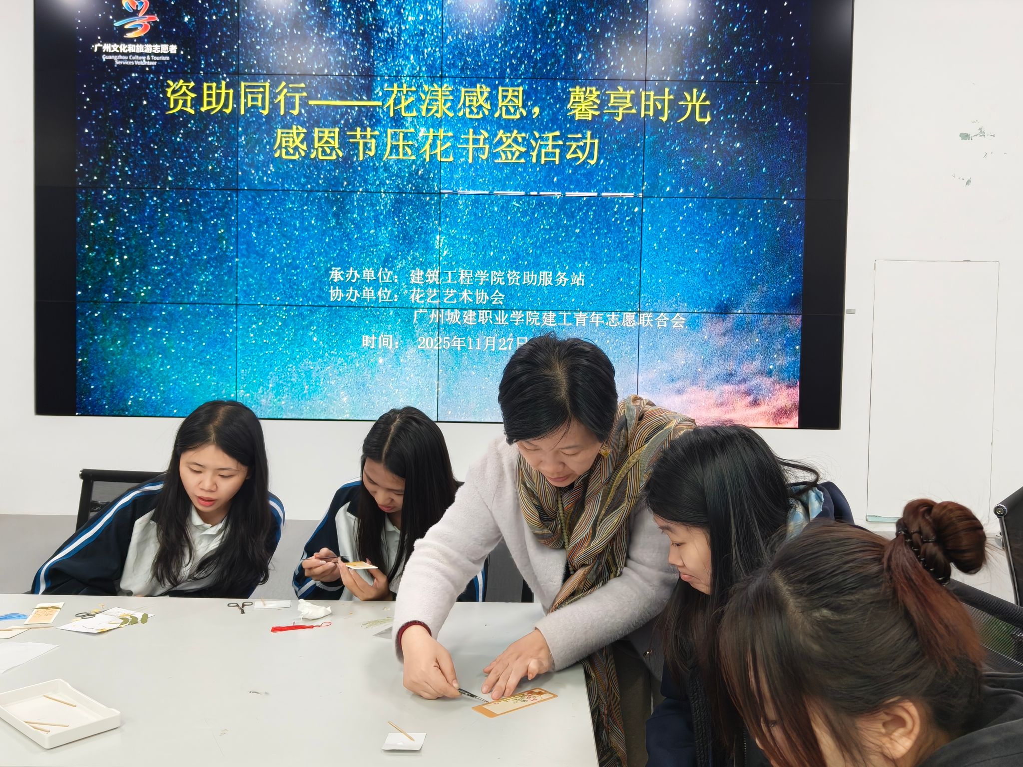 为深化资助育人工作,培养学生的感恩意识,11月27日晚上7:20分,由建筑工程学院资助服务站联合花艺艺术协会、建工青年志愿者联合会在建工机电楼B栋204G教室举办2025年“资助同行——花漾感恩,馨享时光”感恩压花书签活动,活动吸引了近80余名师生参加。