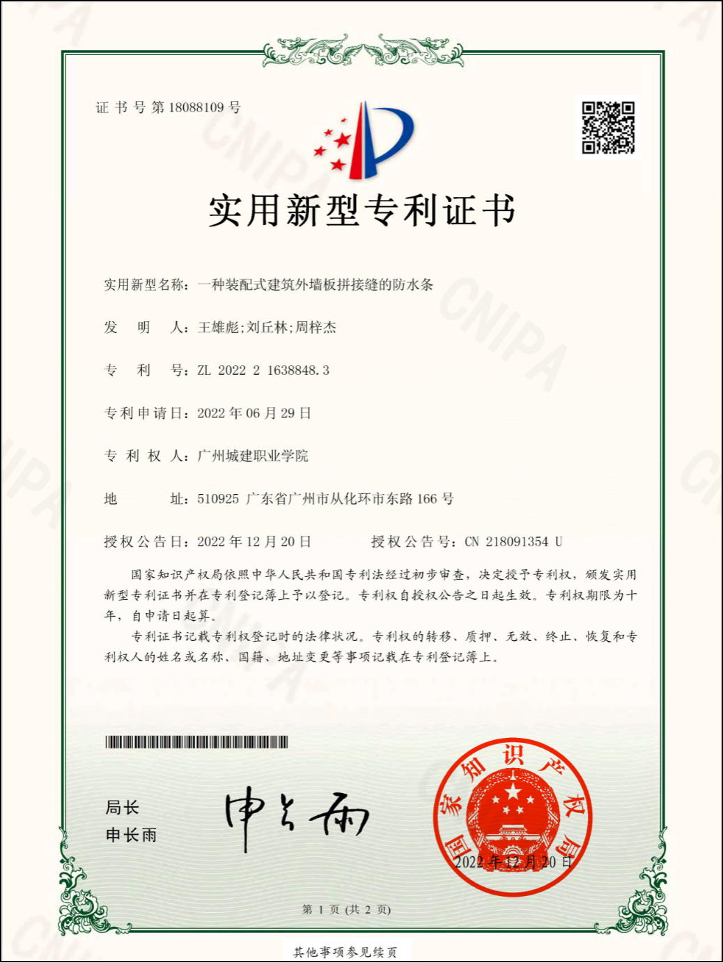 2.2022年12月国家实用新型专利《一种装配式建筑外墙板拼接缝的防水条》证书,为第一发明人。