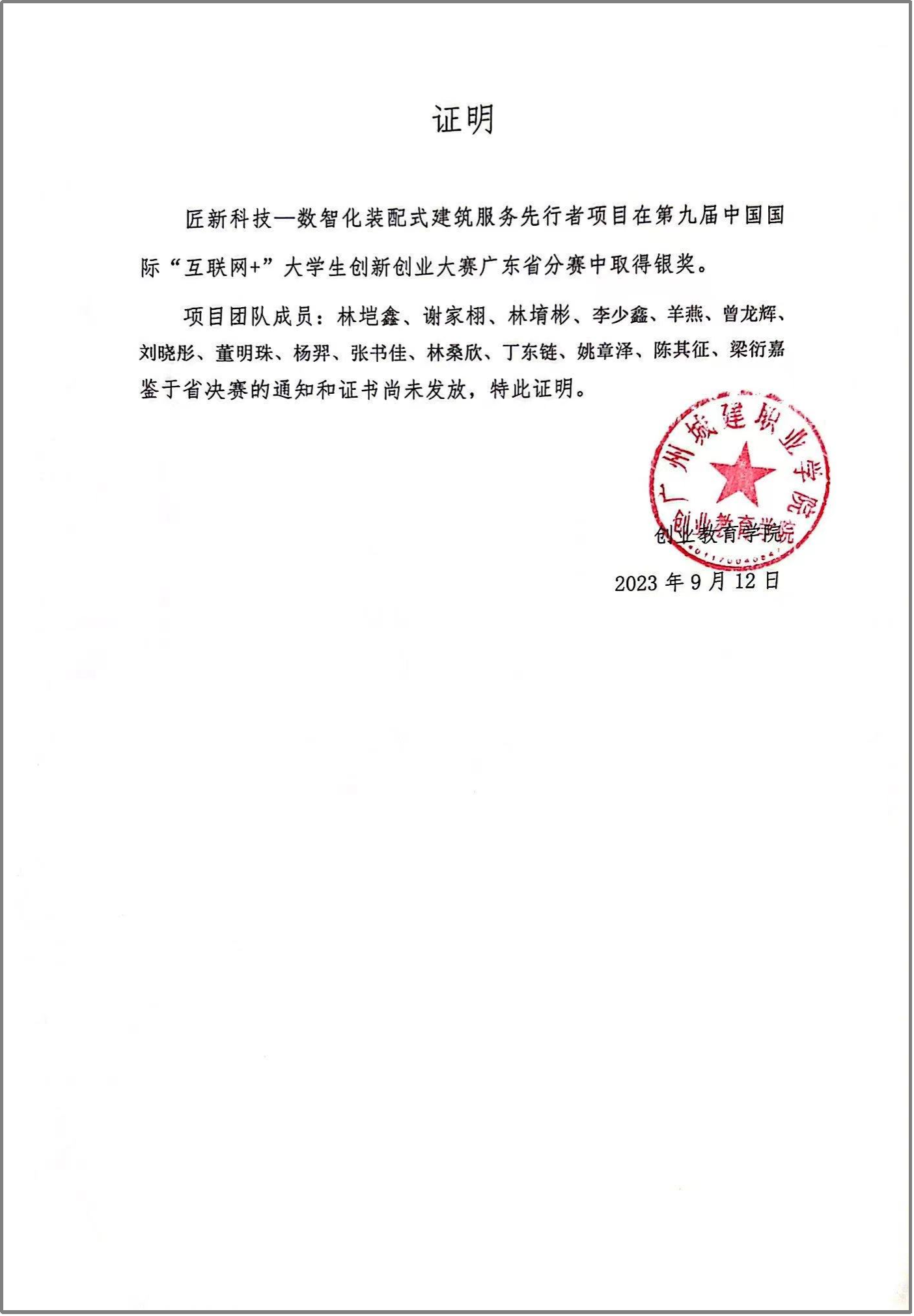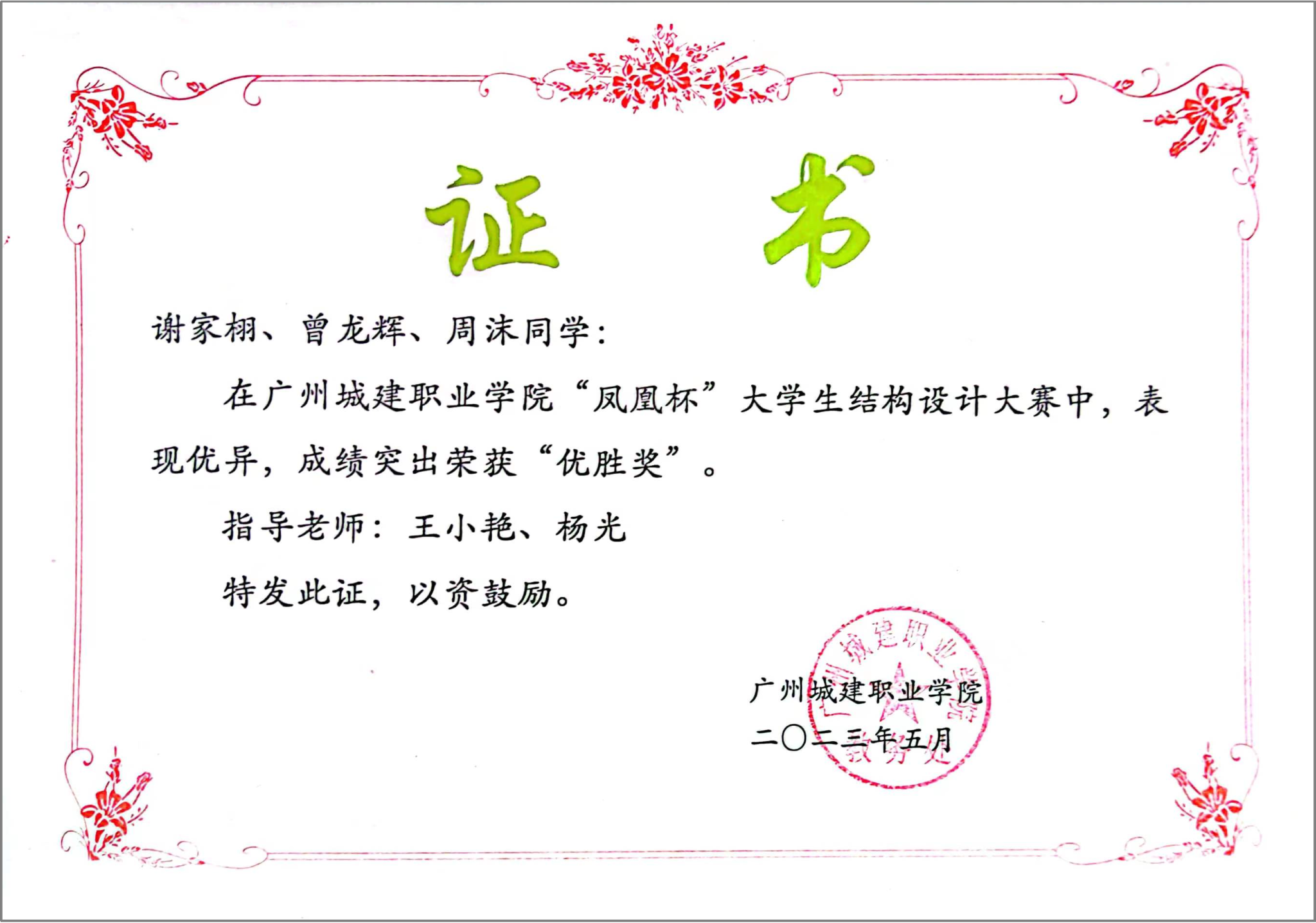 3.2023年5月:广州城建职业学院“凤凰杯”大学生结构设计大赛优秀奖;