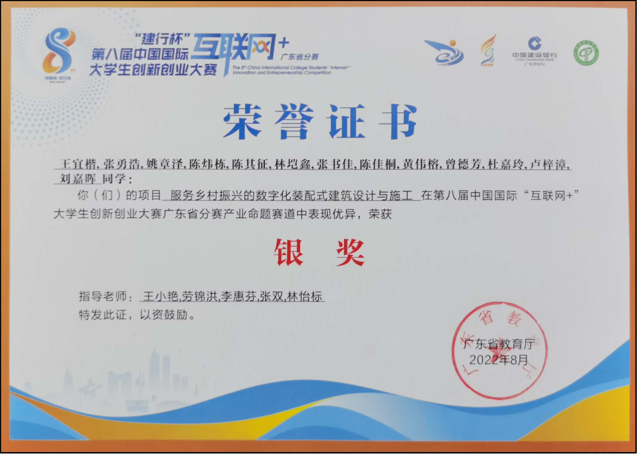 1.2022年8月第八届“互联网+”大学生创新创业大赛(产业赛道)省级银奖;