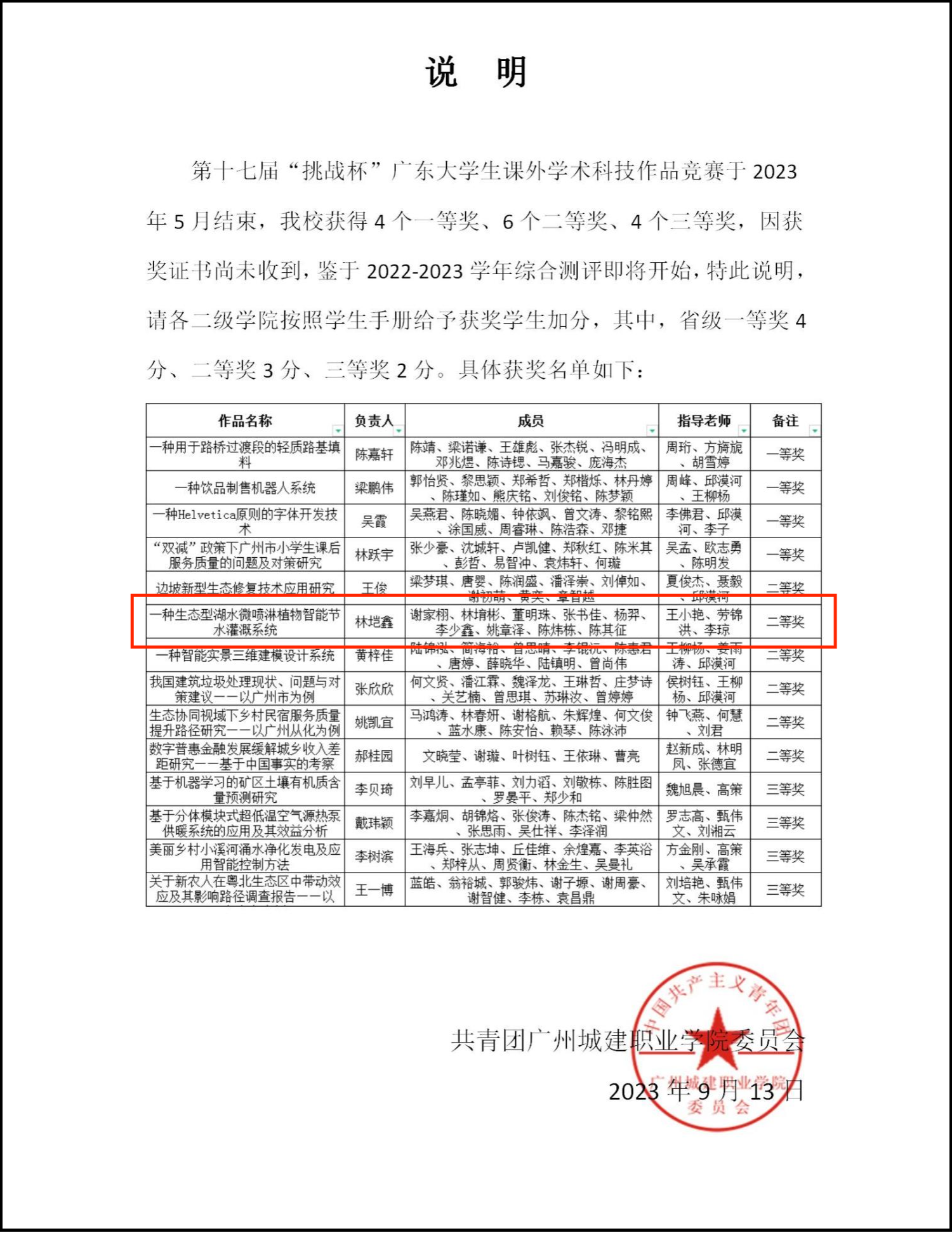 2.2023年6月第十七届“挑战杯”广东大学生课外学术科技作品竞赛“绿美广东”专项赛校赛第一名;