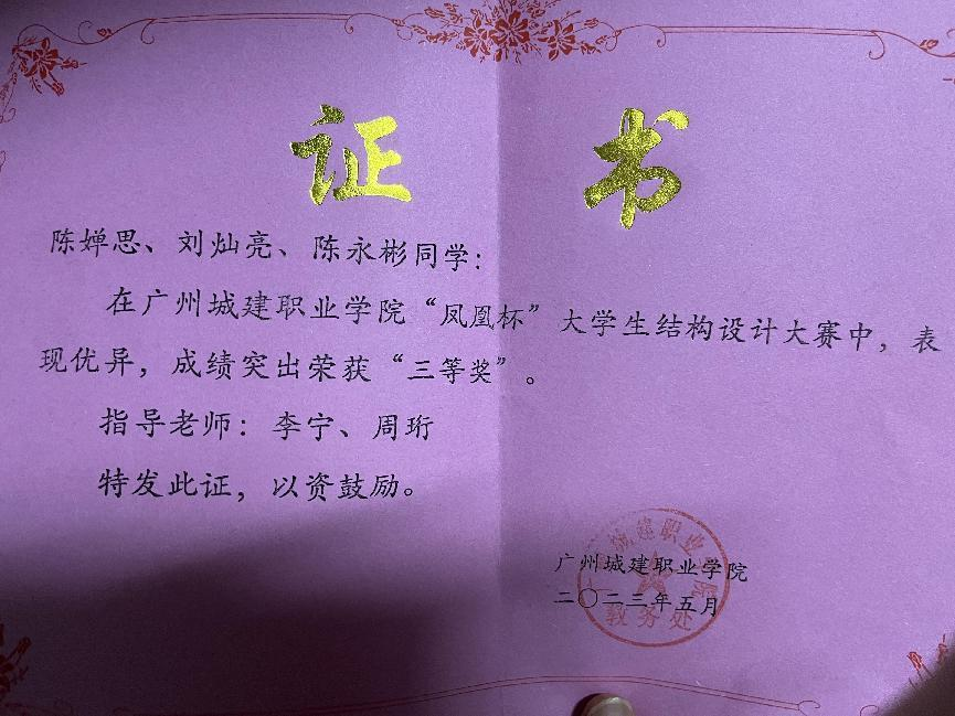 2.2023年5月获广州城建职业学院“凤凰杯”大学生结构设计大赛三等奖;