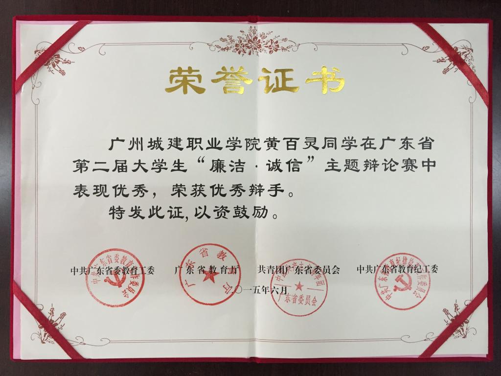 近日,从省教育工委传来喜讯,我校学生黄百灵荣获广东省第二届大学生“廉洁·诚信”主题辩论赛“优秀辩手”称号。