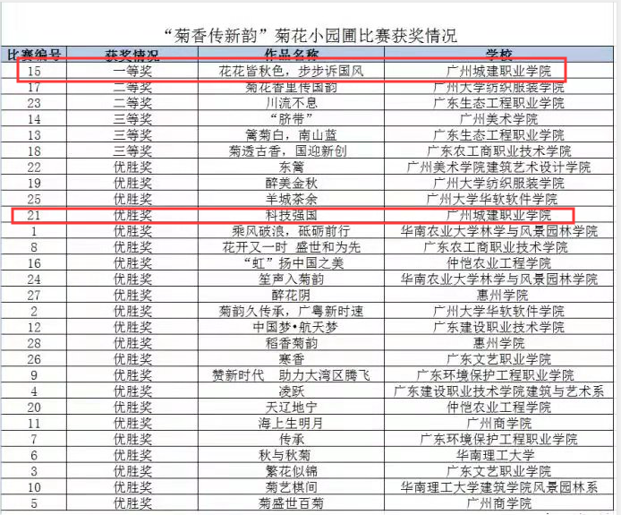 建筑工程学院风景园林设计专业共组织两支师生队伍参加比赛,与华南理工大学、华南农业大学、仲恺农业工程学院等15所高校28支队伍同台竞技。经过前期设计、现场施工、专家评审等环节,由徐瑞萍、石昭华老师指导,吴基芬、吴超洋设计,李嘉华、陈奕敏、王怿、郑铭浩制作的“花花皆秋色、步步诉国风”作品获得本次比赛唯一的一等奖,“科技强国”作品获得优胜奖。