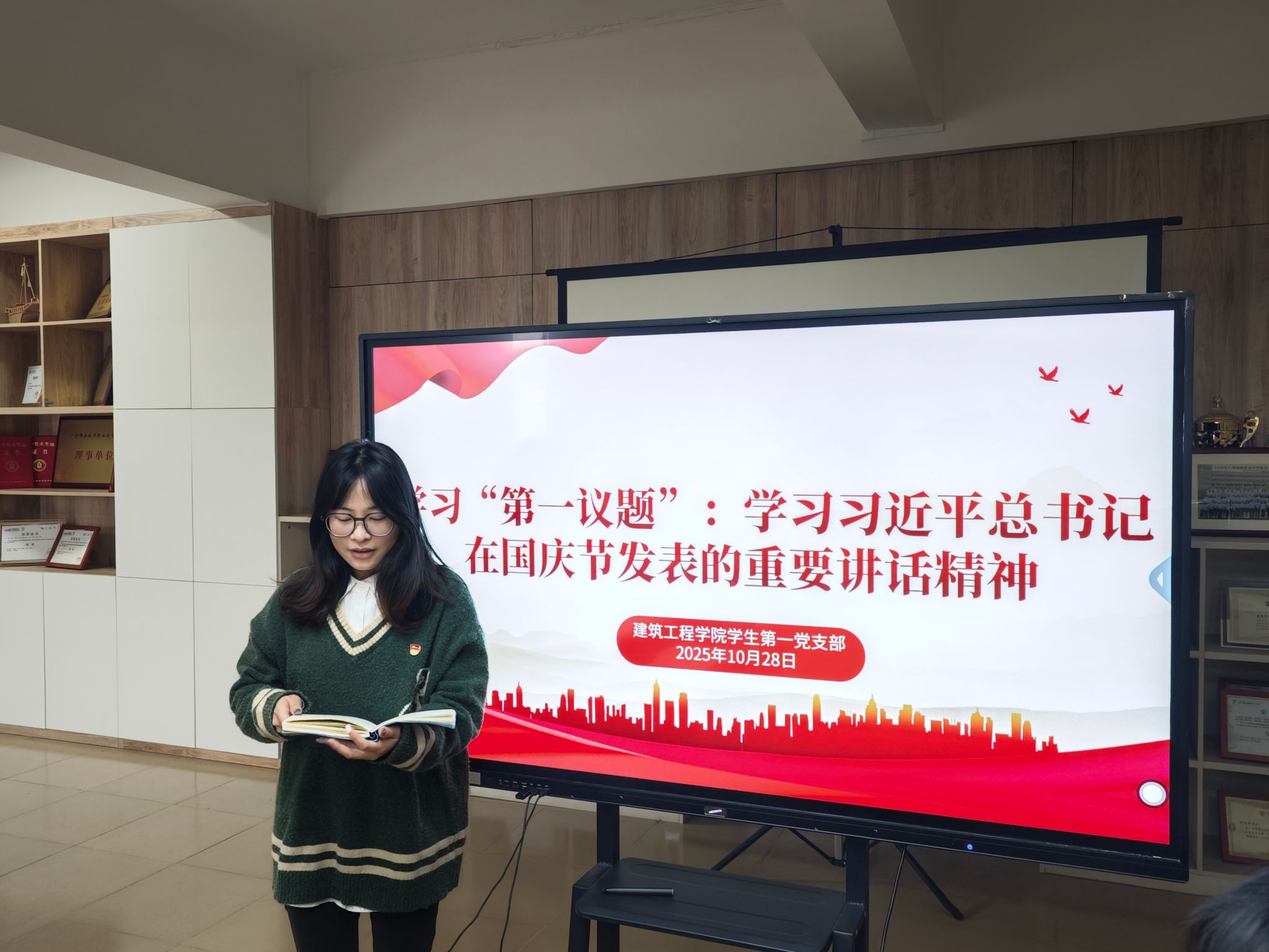 会议伊始,陈健辉同志带领全体党员重温了习近平总书记国庆节重要讲话的核心要义与精神实质,重点解读了讲话中关于青年担当、教育强国、科技创新等与高校师生紧密相关的重要论述。他指出,总书记的讲话饱含对青年一代寄予殷切期望,作为青年党员教师,我们要牢记嘱托,立足专业所长,在学生工作领域深耕细作,以过硬本领回应时代召唤。随后,柯燕梅同志结合教育教学实践与自身感悟,与支部党员分享了学习心得。她表示,作为高校教师党员,要始终坚守立德树人根本任务,将讲话精神融入课堂教学与育人全过程,既传授专业知识,更培育学生的家国情怀与社会责任感,引导青年党员树立正确的职业观、价值观,在城乡建设、基础设施完善等国家重点领域勇挑重担。