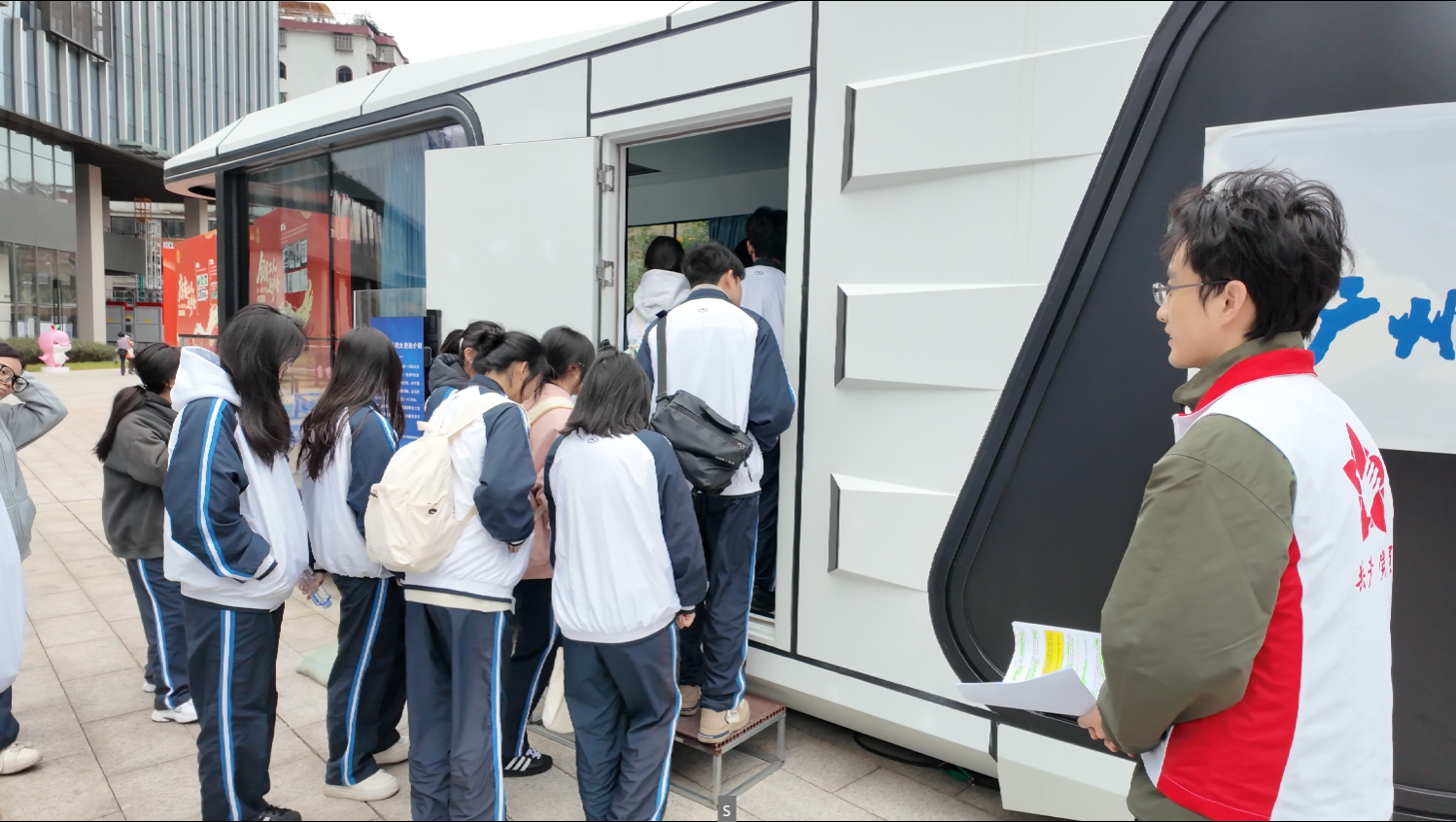 活动伊始,党员志愿者带领师生开启沉浸式研学之旅。首站映入眼帘的“星舫”系列太空舱,作为集成式可移动模块化建筑产品,集智能控制系统与智能家居系统于一体,生动呈现了模块化建筑的便捷与智能。