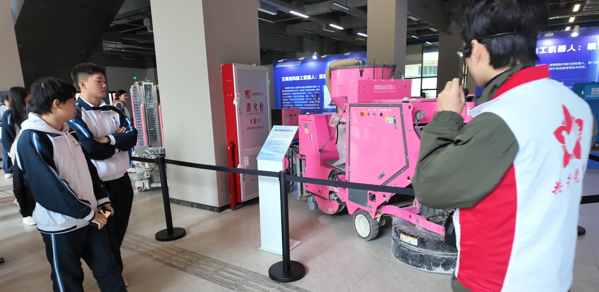 随后,师生们走进模拟工地现场,深入了解模板悬挂系统、挂架系统、钢桁架平台等先进施工技术,对智能化现场管控有了具象认知。同学们提问踊跃,现场工作人员以专业的角度细致解答,交流气氛热烈。在智能装备展区,地坪研磨机器人、喷涂机器人、混凝土整平机器人等“硬核”装备轮番亮相,其精准高效的作业模式让同学们赞叹不已。在智能设计平台展区里,AI智能方案设计平台、构未来・家居设计平台、数智家・实景三维可视化平台、岭南风格装配式独栋建筑、BIM建模设计模型等内容,与专业课程高度契合,引发同学们结合课堂知识展开深入讨论。中建四局科创大厦项目“云端建造工厂系列智慧管控平台”的3D系统,更让大家领略到智慧建造的前沿魅力。活动期间,师生还集中观看广州“好房子”智能建造介绍视频与“匠心传承,智造未来”主题宣传片,从行业发展成果中汲取奋进力量。