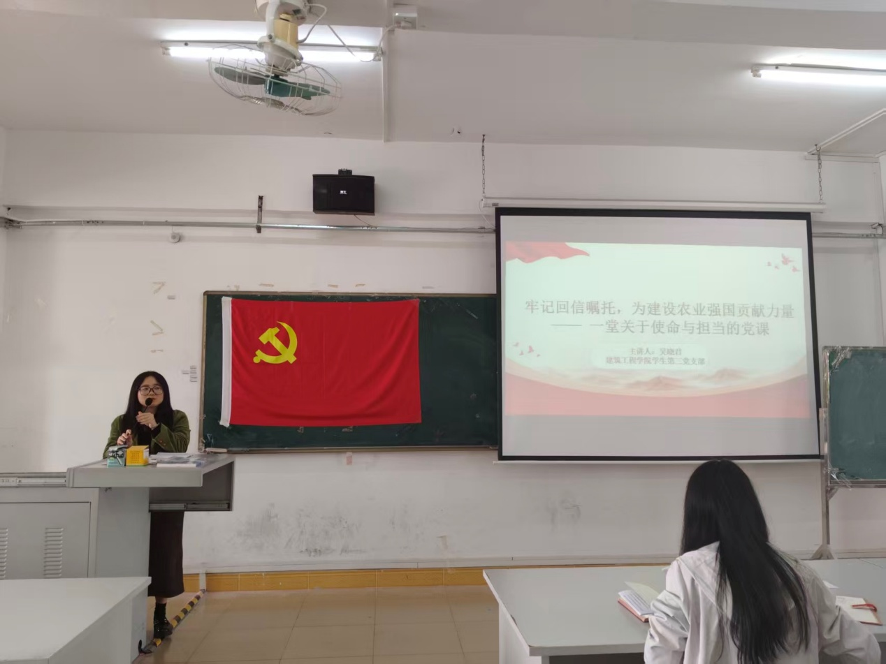 为深化入党积极分子的理想信念教育,引导其将个人理想融入国家建设大局,2025年12月19日15:30,建筑工程学院学生第三党支部于建工机电楼504教室举办了“牢记回信嘱托,为建设农业强国贡献力量”专题党课。本次党课由党支部书记吴晓君同志主讲,全体党员与入党积极分子积极参与。