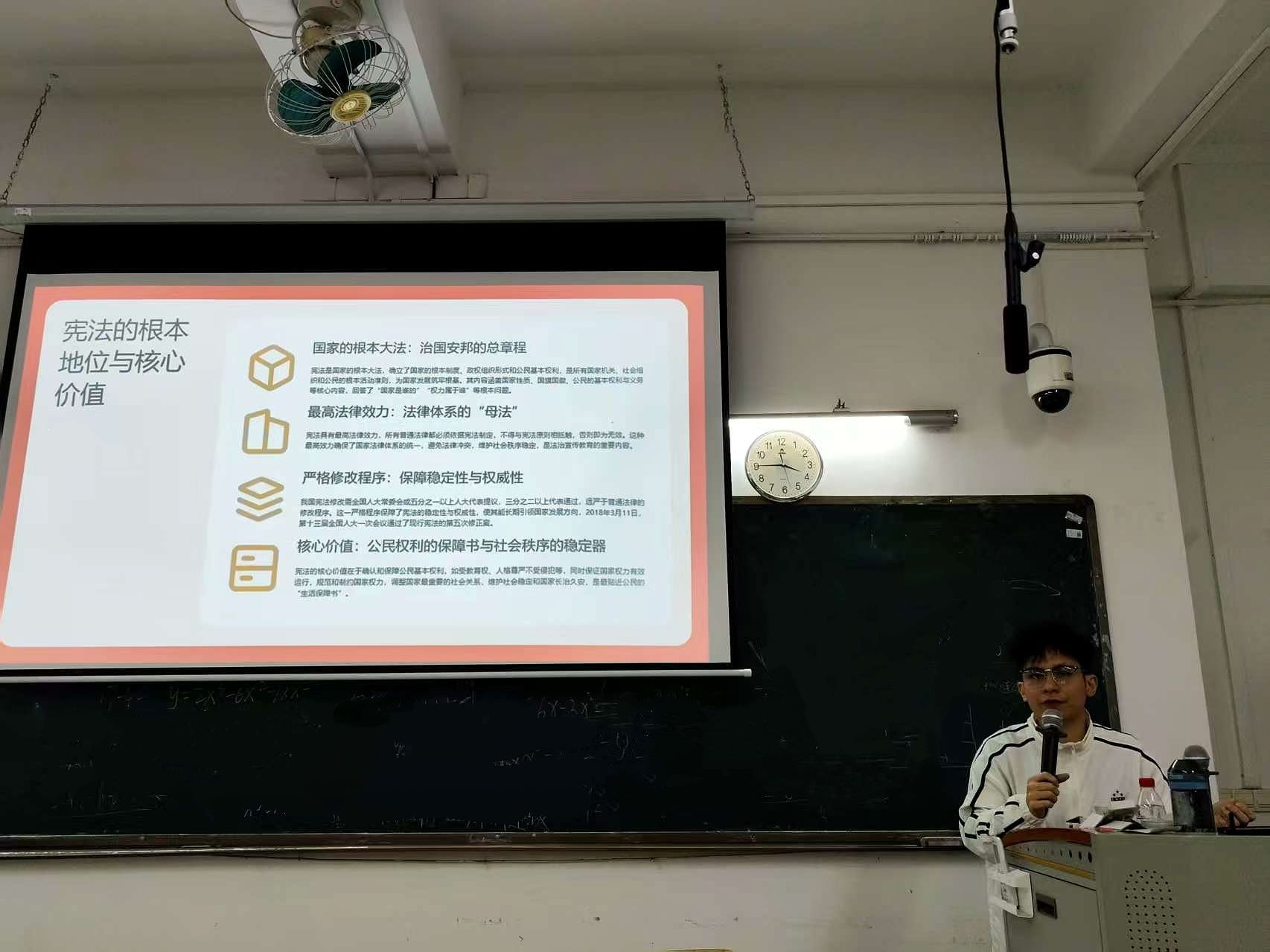 陈健辉同志结合党的二十大关于全面依法治国的战略部署,围绕宪法的历史地位、核心要义与时代价值展开讲解。他系统梳理了我国宪法的发展历程,强调宪法作为国家根本大法,是治国安邦的总章程,也是全体公民权利的保障书。党课中,结合青年大学生实际,他通过案例分析、法条解读等方式,重点阐释了宪法在高职院校人才培养、校园治理及学生成长中的指导作用,引导学生深刻理解“依法治国首先要依宪治国,依法执政首先要依宪执政”的深刻内涵。