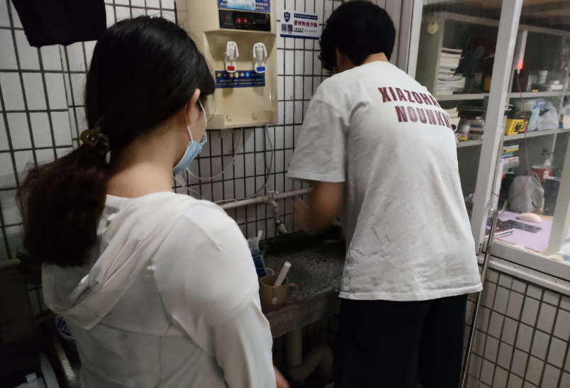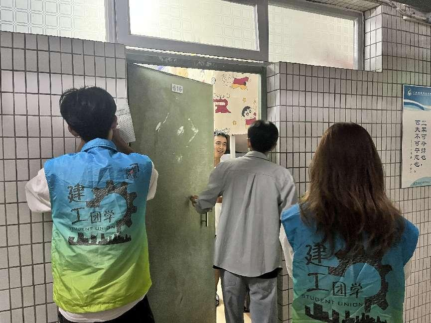 随后,辅导员与团委、学生会成员迅速行动,分组进入学生宿舍进行检查。他们仔细查看了宿舍内的卫生状况,重点检查了阳台、卫生间等易积水区域,确保没有积水现象并现场对学生进行了安全教育。