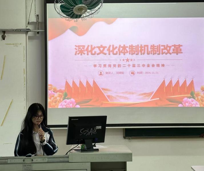 本次讲座围绕《深化文化体制机制改革》主题展开。刘倬如同志以深化文化体制机制改革为主要方向,围绕改革的重大意义、主要任务和实施路径等方面进行了阐述,并为在场的学生提出了富有建设性的意见和建议。最后,20栋工作站成员陈一鹏老师进行总结。他希望同学们以本次“育人队伍”进社区理论宣讲为契机,认真学习领会党的二十届三中全会精神,要坚定拥护“两个确立”、坚决做到“两个维护”,将思想融入到个人生活学习当中,不断加强政治修养。