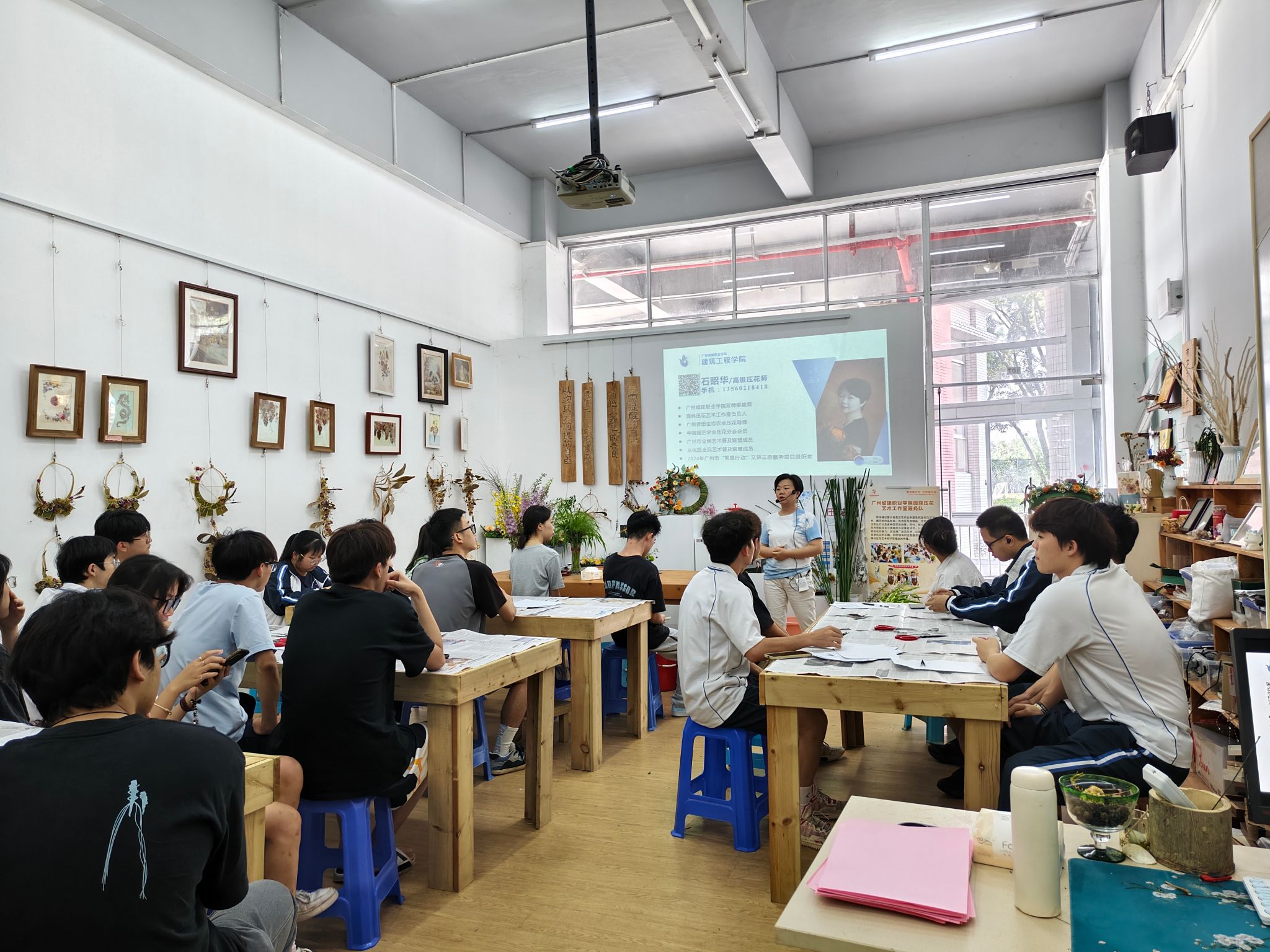 2025年5月15日下午三点,由学生处主办,19、20栋功能型党支部承办的“园林种植与压花艺术体验”第二课活动,在建工机电楼107压花艺术工作室举行。活动吸引了建工、人文、机电和信工等学院30余名学生参加。