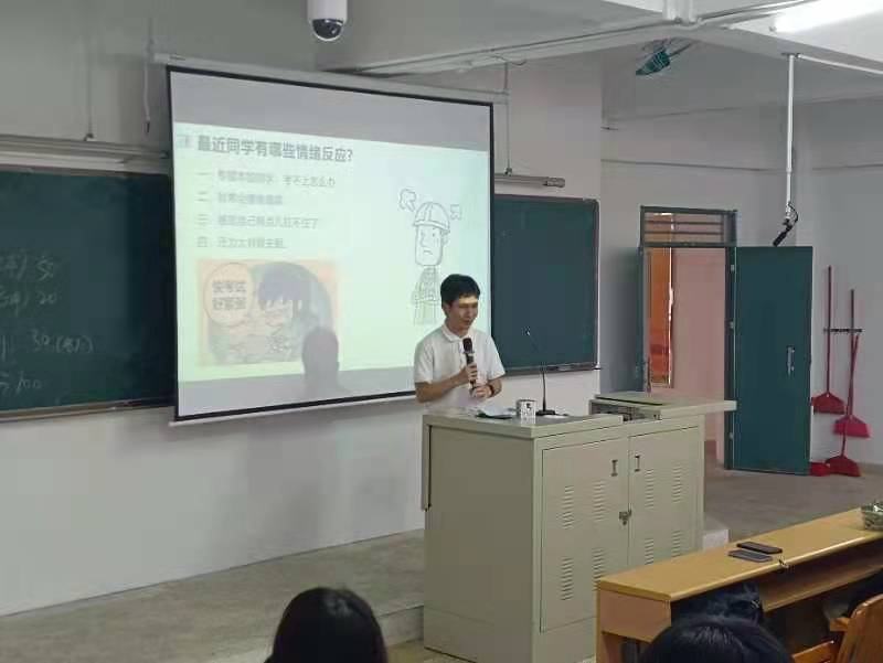随后,建筑工程学院心理辅导站指导老师陈健辉对2019级在校学生进行心理辅导,从心理压力产生的原因、发展过程等多个方面进行介绍,为2019级在校学生提供了多种心理压力疏导的方法并指导2019级在校学生开展的冥想放松训练,让学生卸掉来自学习生活上的各种心理压力。