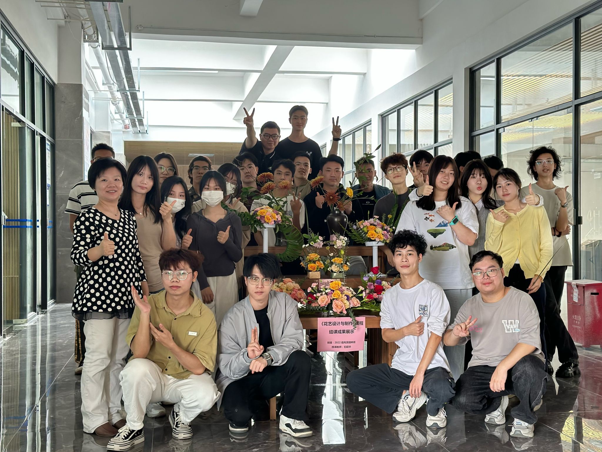 师生们欢聚一堂,留下了珍贵的合照。这一刻,不仅是对学生们辛勤耕耘与才华横溢的见证,更是师生情谊与学术传承的美好定格。石昭华老师和徐瑞萍老师以其深厚的专业底蕴和无私的奉献精神,为学生们提供了宝贵的指导与鼓励,激发了他们在花艺设计领域勇于探索未知、敢于突破常规的勇气与决心。