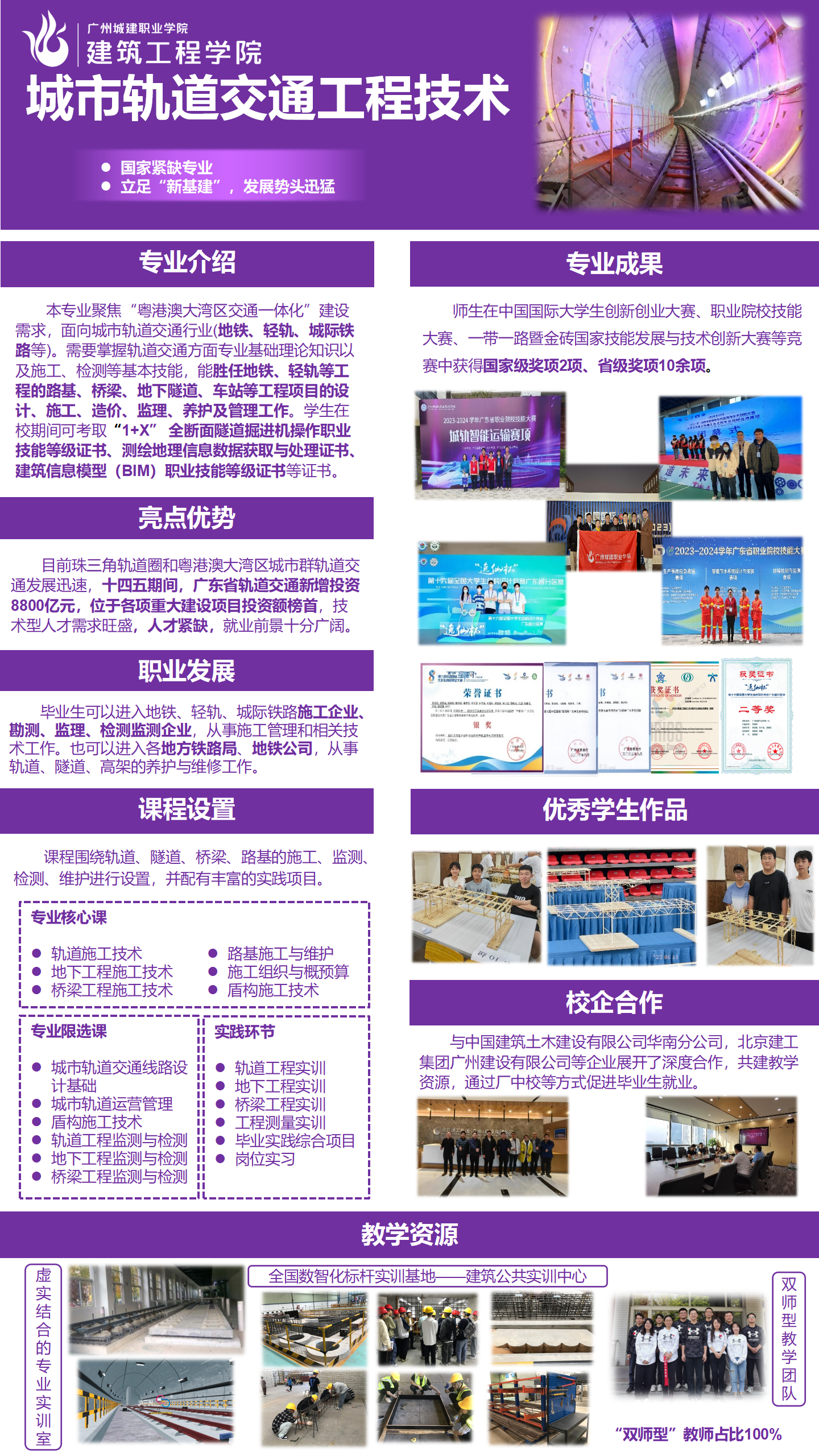 本专业聚焦“粤港澳大湾区交通一体化”建设需求,面向城市轨道交通行业(地铁、轻轨、城际铁路等)。需要掌握轨道交通方面专业基础理论知识以及施工、检测等基本技能,能胜任地铁、轻轨等工程的路基、桥梁、地下隧道、车站等工程项目的设计、施工、造价、监理、养护及管理工作。