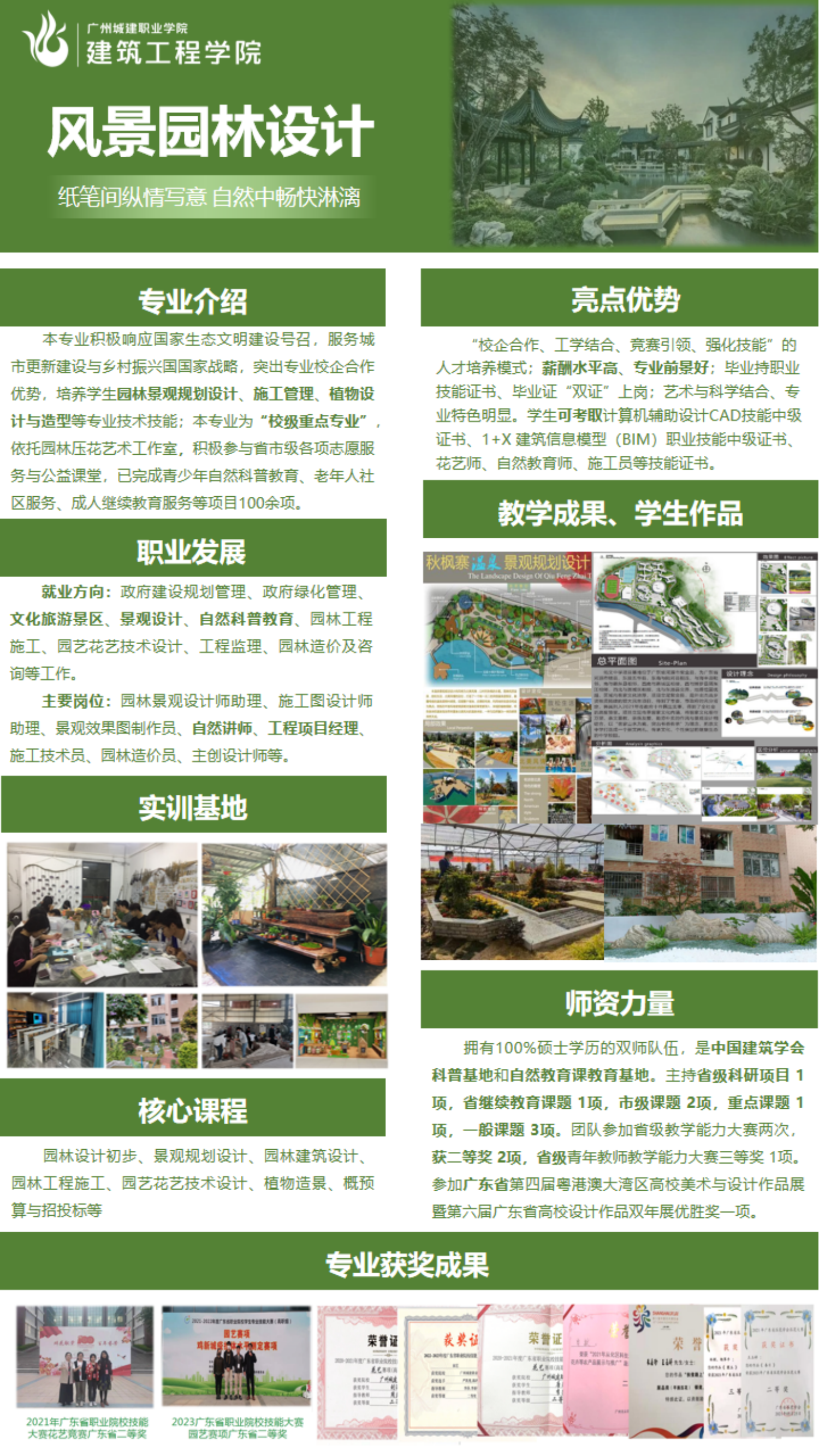 本专业积极响应国家生态文明建设号召,服务城市更新建设与乡村振兴国国家战略,突出专业校企合作优势,培养学生园林景观规划设计、施工管理、植物设计与造型等专业技术技能;本专业为“校级重点专业”,依托园林压花艺术工作室,积极参与省市级各项志愿服务与公益课堂,已完成青少年自然科普教育、老年人社区服务、成人继续教育服务等项目100余项。本专业可考取计算机辅助设计CAD技能中级证书、1+X 建筑信息模型(BIM)职业技能中级证书、花艺师、自然教育师、施工员等技能证书。