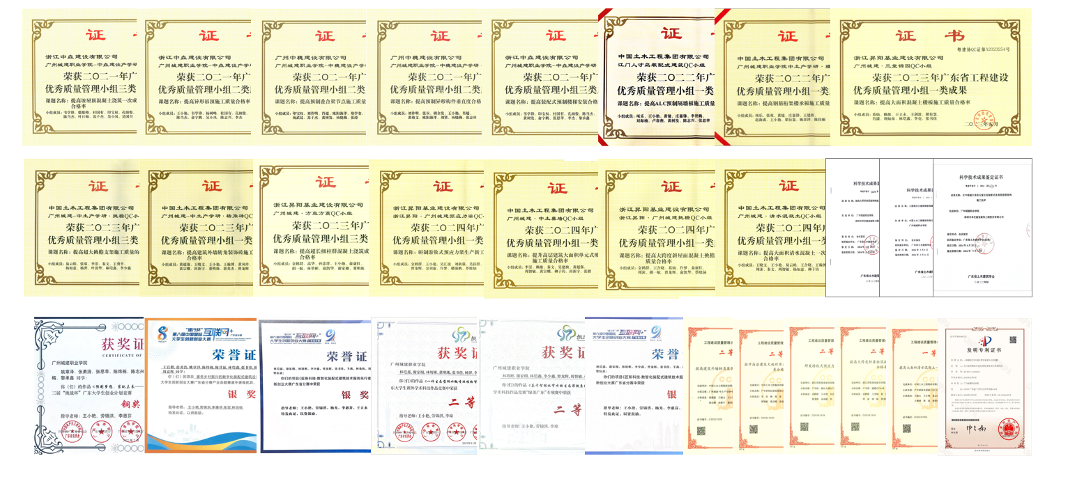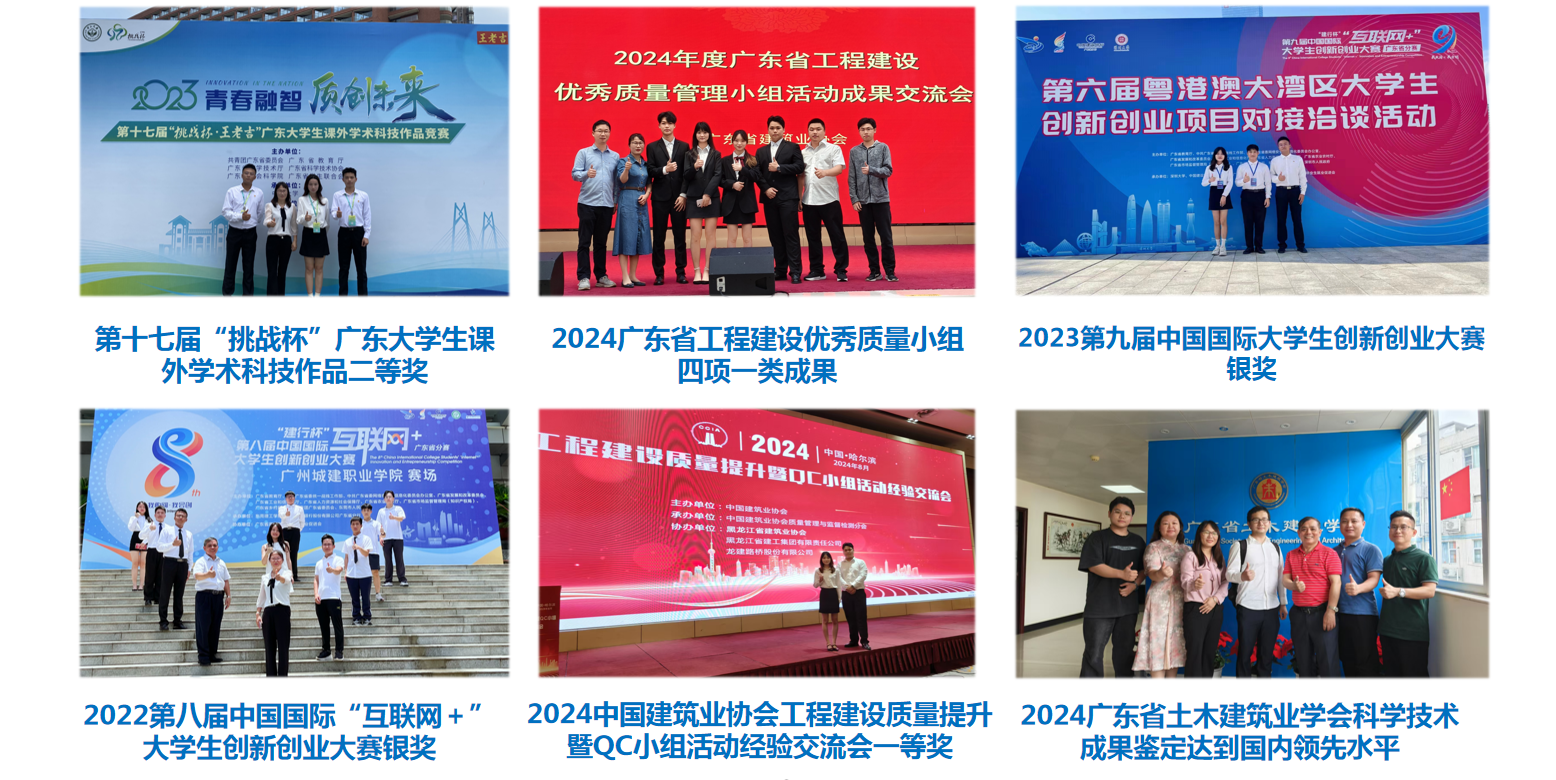 近三年,本专业学生获中国国际互联网+大赛广东省分赛银奖3项;广东省职业院校技能大赛建筑工程识图一等奖2项,二等奖4项;“挑战杯“广东大学生课外学术科技作品竞赛二等奖3项;广东省科技创新战略专项资金(“攀登计划”专项资金)3项;广东省学生职业技能技能“装配式智能建造”、“BIM深化设计”、省质量改进成果(QC成果)等获奖20余项、专利10余项。