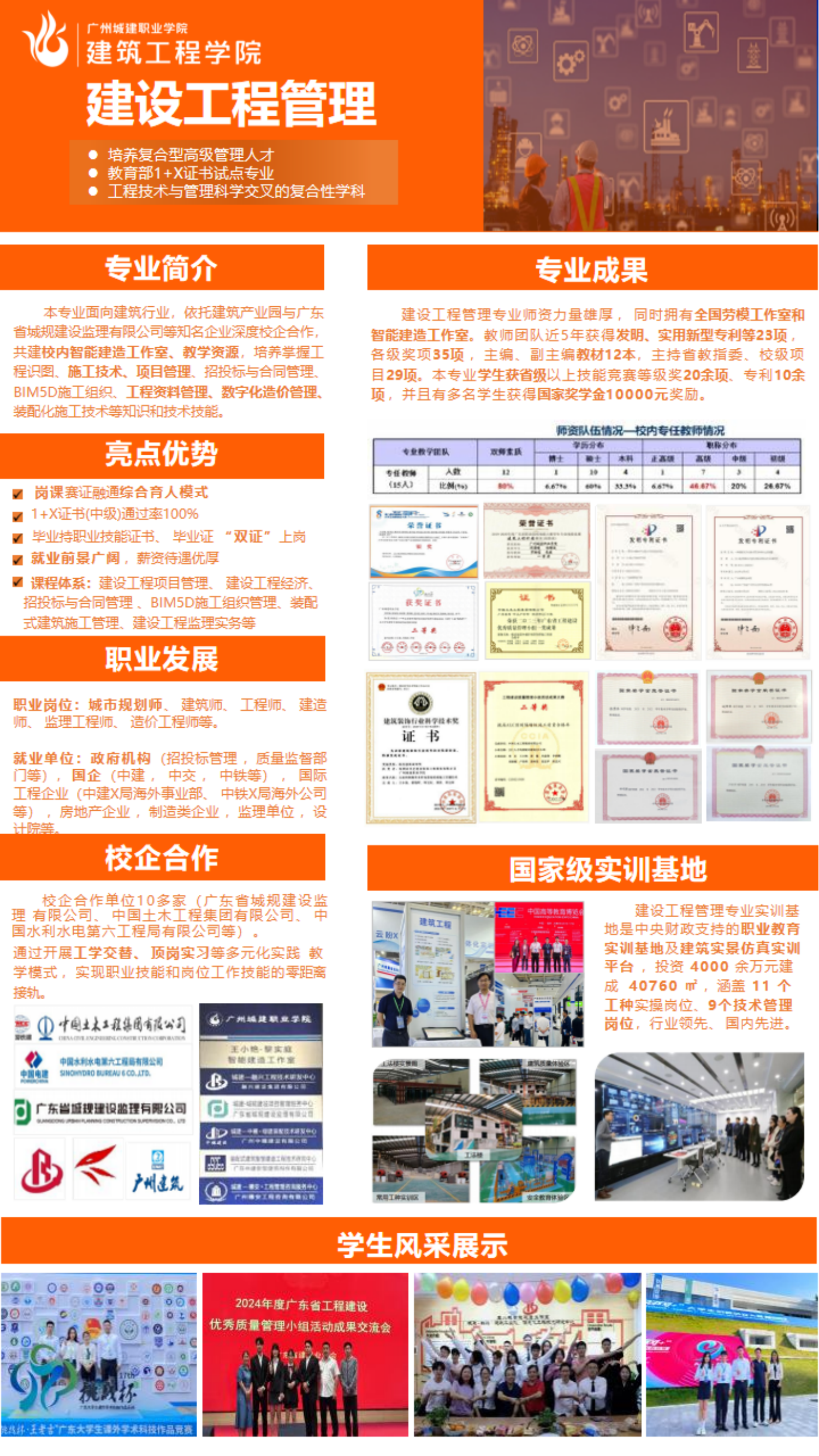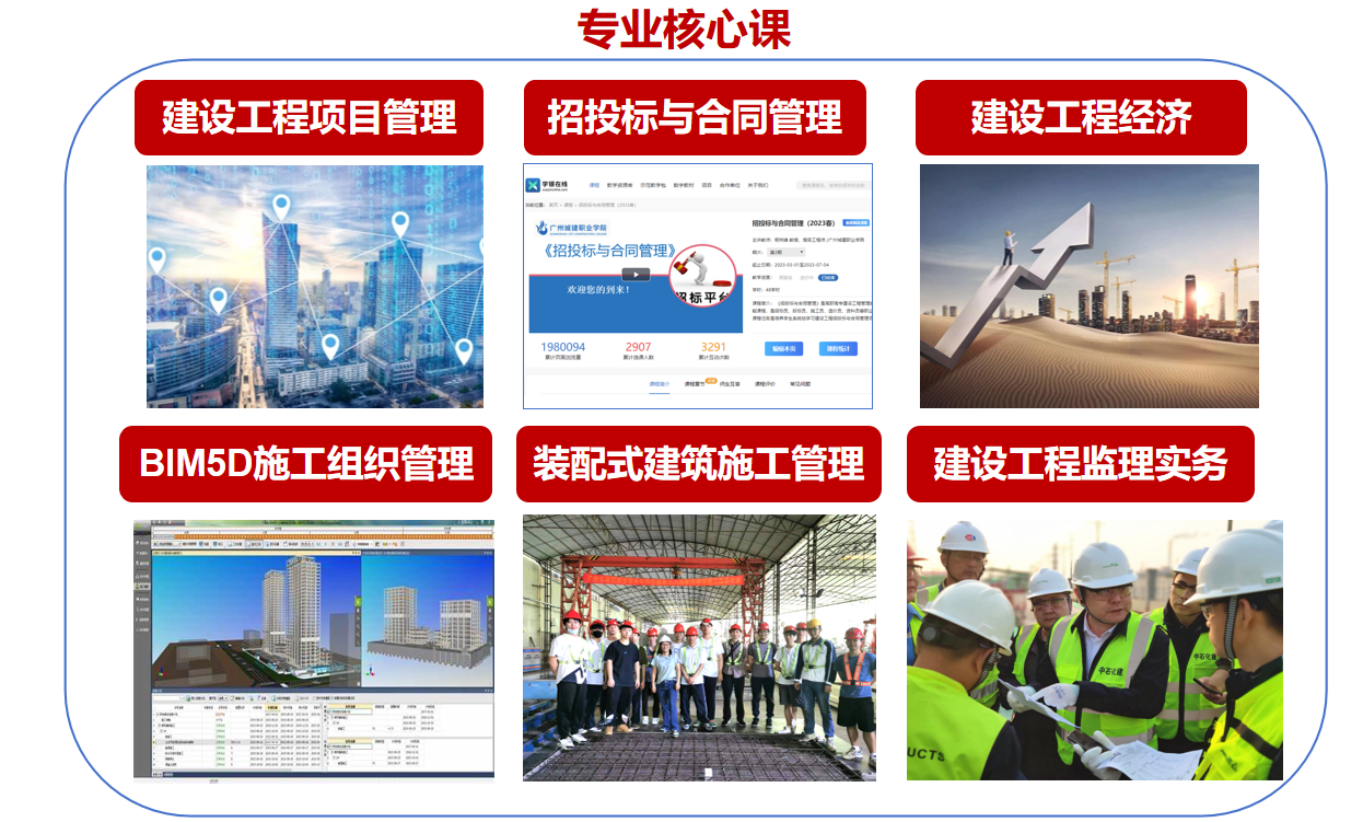本专业面向建筑行业,依托建筑产业园与广东省城规建设监理有限公司等知名企业深度校企合作,共建校内智能建造工作室、教学资源,培养掌握工程识图、施工技术、项目管理、招投标与合同管理、BIM5D施工组织、工程资料管理、数字化造价管理、装配化施工技术等知识和技术技能。