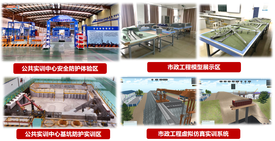 本专业实训依托学校现代建筑技术职业技能公共实训中心开展校内专业实训,该中心是世界技能大赛混凝土建筑项目中国集训基地,该基地占地11974平方米,设备总值662万元,设备总数269台套,可开展安全教育体验馆、基坑防护展示、模板综合实训、砌筑工实操、钢筋工实操、架子工实操、钢结构安装实操、主体综合实操、基础综合实操、构件制作工实操、构件装配实操、灌浆工实操等实验实训项目。同时,道桥隧虚拟仿真实训基地即将投入使用。