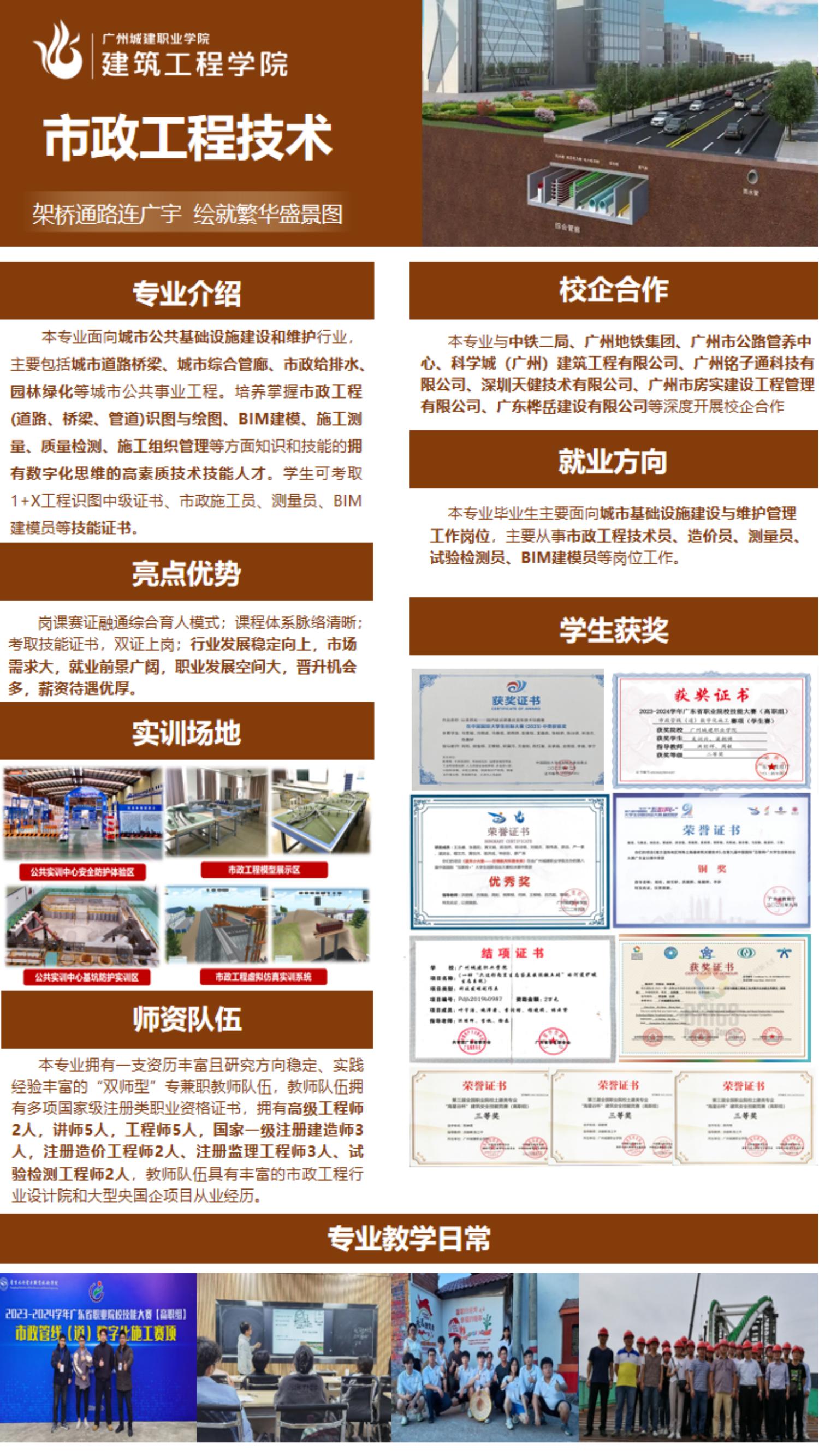 本专业面向城市公共基础设施建设和维护行业,主要包括城市道路桥梁、城市综合管廊、给排水、园林绿化等城市公共事业工程。培养掌握市政工程(道路、桥梁、管道)识图与绘图、BIM建模、施工测量、质量检测、施工组织管理等方面知识和技能的拥有数字化思维的高素质技术技能人才。