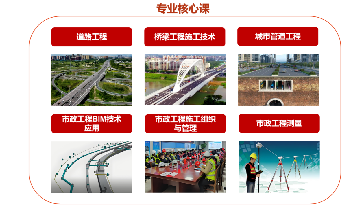 本专业毕业生主要面向城市基础设施建设与维护管理工作岗位,主要从事市政工程技术员、造价员、测量员、试验检测员、BIM建模员等岗位工作。
